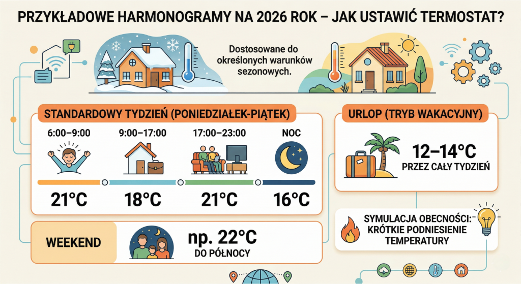Przykładowe harmonogramy na 2026 rok – jak ustawić termostat?