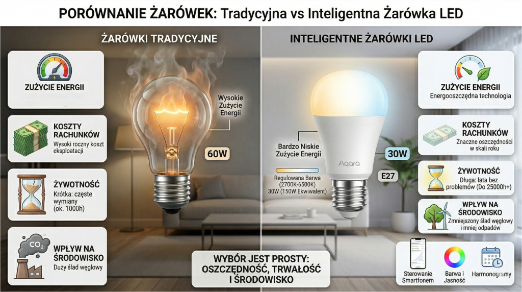 Jakie modele zasługują na uwagę? Aqara LED Bulb T2 CCT E27 to inteligentna żarówka, która pozwala na regulację jasności i temperatury światła. Montujesz ją w standardowym gwincie E27, łączysz z aplikacją i gotowe. Nie ma tutaj mowy o skomplikowanych ustawieniach ani wielogodzinnym montażu.