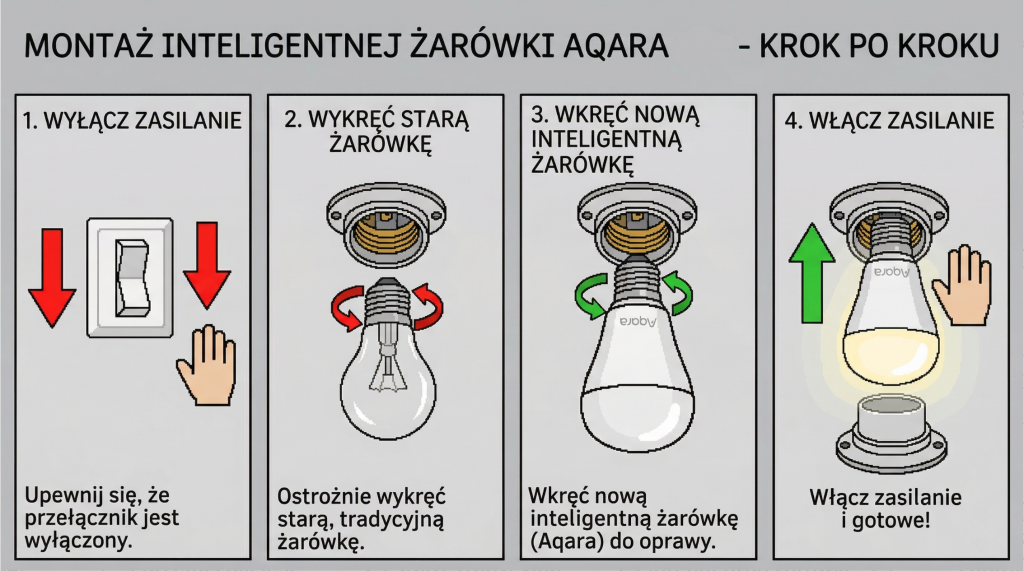 Wszystkie opisane wyżej lampy i moduły pozwalają na zbudowanie inteligentnego oświetlenia bez remontu oraz używania specjalistycznych narzędzi. Największą zaletą takich rozwiązań jest wygoda, a także wyjątkowo prosty montaż. Jak on wygląda w zależności od konkretnych elementów? Oto opis poszczególnych czynności: